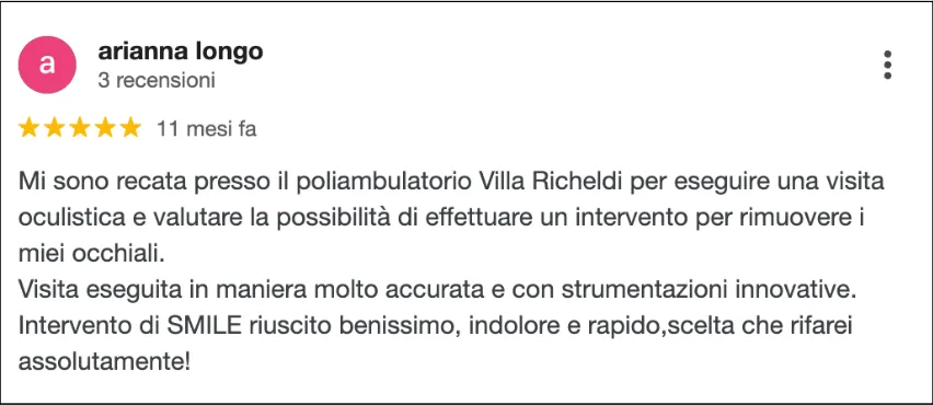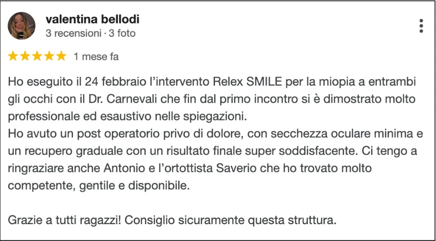 “Intervento di SMILE riuscito benissimo, indolore e rapido, scelta che rifarei assolutamente!”